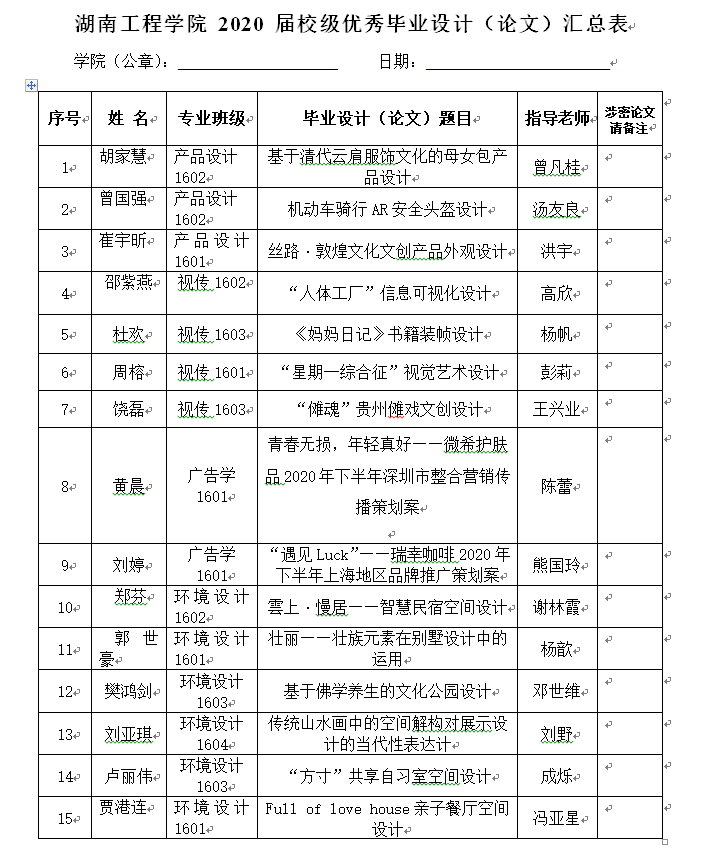 根据《樱花动漫 2020届校级优秀毕业设计(论文)评选办法》,各教研室推送2020届校级优秀毕业设计(论文)共计15篇,经院内教学委员会评审通过,推选邵紫燕同学的《“人体工厂”信息可视化设计》等15篇毕业设计(论文)参评2020届校级优秀毕业设计(论文),现予以公示,公示期为5个工作日。