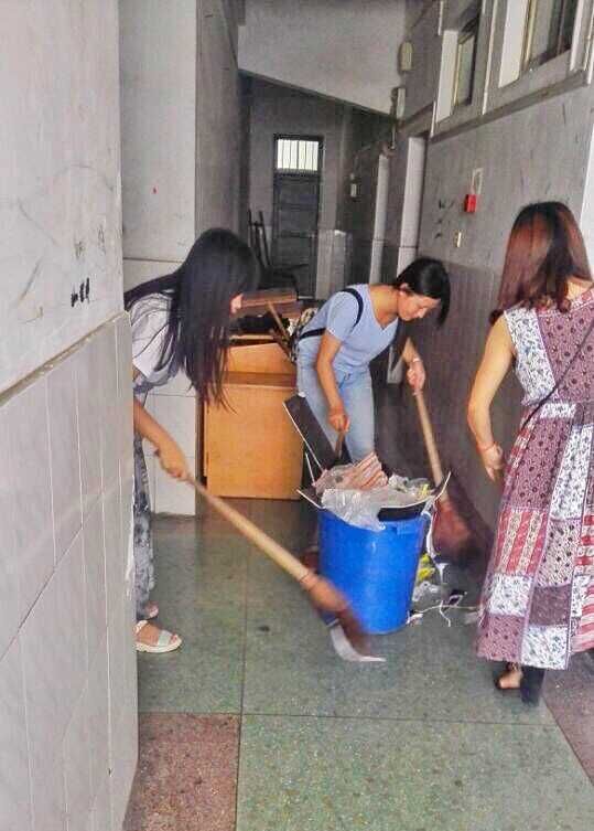 活动中,志愿者们分小组针对公共区卫生和校园死角进行卫生维护。尽管天气闷热,志愿者依旧顶着满头的汗水将教室和走廊扫拖干净。自6月8日以来,樱花动漫