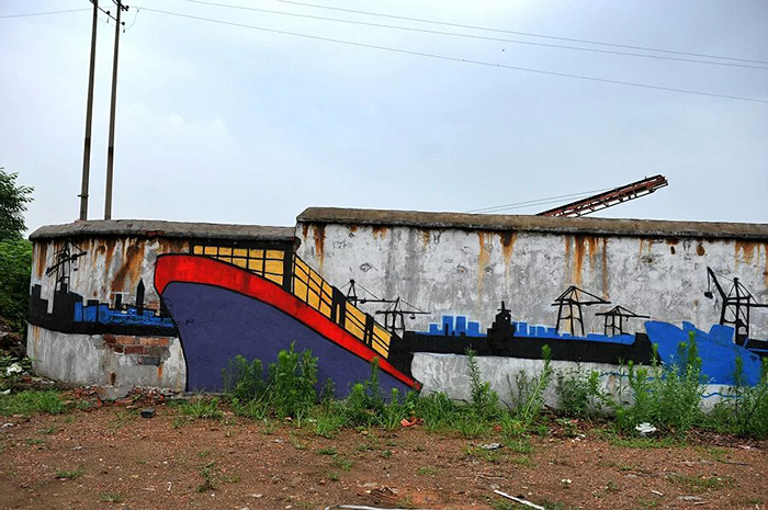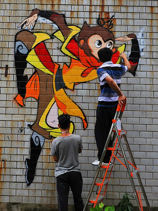 胡大虎老师担任首席艺术指导,胡大虎带领艺术设计学院平面设计专业1204班优秀学生团队全程参加,负责窑湾艺术涂鸦的设计制作和宣传工作,他们联合本地涂鸦高手来共同完成这项创作,其中精彩的作品已经受到广泛的关注和热捧。