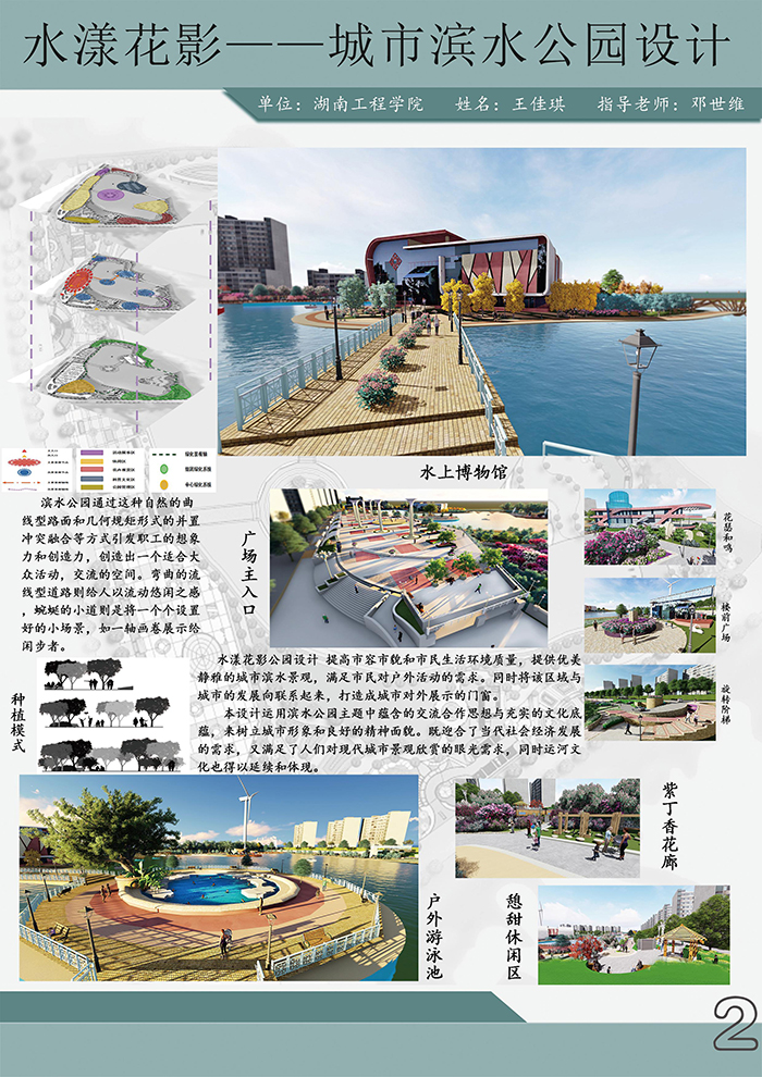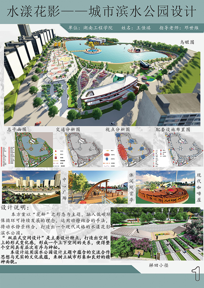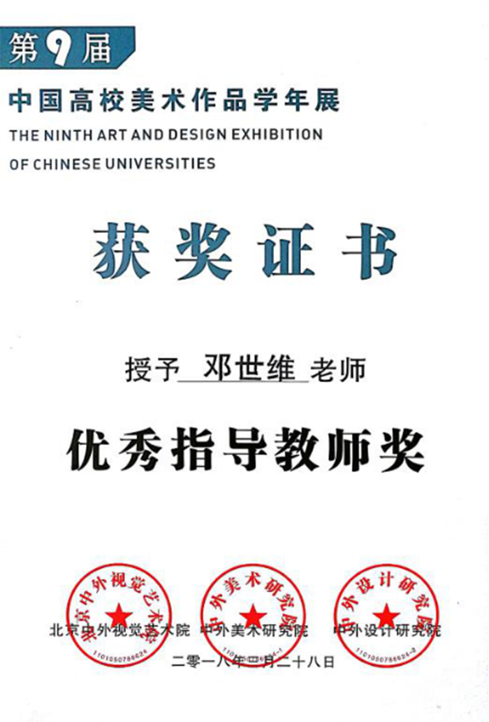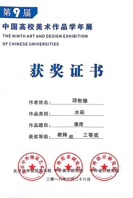 教师邓世维水彩作品《港湾》获教师组三等奖和优秀指导教师奖。在邓世维老师的指导下,环境设计专业学生王佳琪的作品《水漾花影——城市滨水公园设计》从全国344件作品中脱颖而出,获得二等奖,许海兵、郑文轶、黄亚男、岳修能、李楚风和王元坤同学设计的作品分别获得优秀作品奖。