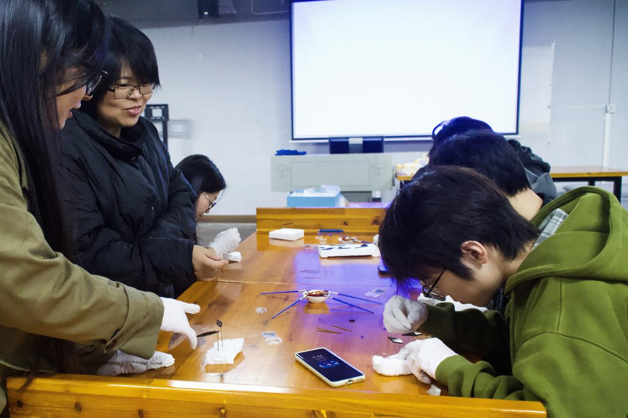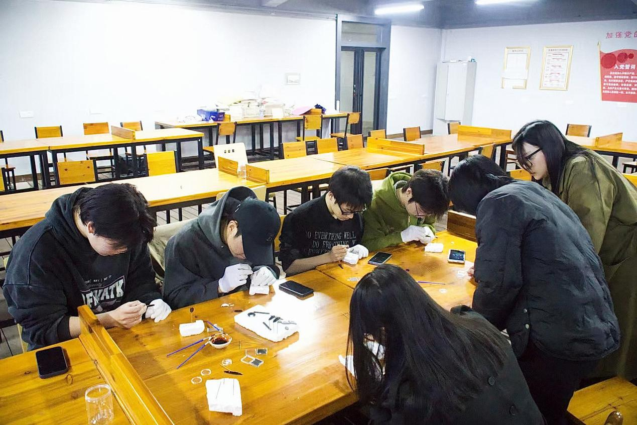 理论讲解结束后,活动进入了备受期待的实操环节。在刘泽雅的亲身示范与细致指导下,师生们逐步体验了传统漆艺中的几项核心装饰与制作步骤。大家亲手尝试贴螺钿——将精致闪亮的贝壳片镶嵌于漆面,感受材质对比带来的视觉趣味;学习了上漆(髹漆)的基本手法,体会漆液在器物表面形成的温润质感与深邃层次;并初步接触调漆流程,了解如何通过调配漆液与辅料来实现不同的艺术效果。现场气氛专注而热烈,每一道工序都让参与者切身感受到大漆工艺的细腻、严谨与独特魅力。