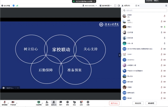 缪智文对当前的国家政策进行了梳理,并就学院的情况进行了数据分析。他指出,在接下来的就业关键时期,希望家长与学校能够协力同心、充分交流,充分发挥家校育人合力,为学生就业发展保驾护航,共同助力学生走好大学“最后一公里”。并向家长们提出三点建议:一是树立良好心态,克服“就业迷茫”。多与学院及辅导员联系,及时了解和掌握孩子的思想、学习、生活情况,关注关心孩子的身心健康状况,避免从众心理、理想主义和依赖心理,及时调整自己的就业期望值。二是了解就业政策,把握就业形势。帮助学生从宏观上了解国家就业政策,从微观上了解自己所学专业就业的基本情况,正确分析自己所处的求职地位,积极主动适应社会需要。三是客观评价能力,明确职业方向。引导学生客观、充分地认识和衡量自己的能力,确定适当的择业目标,结合社会需要和自身实际,积极调适自己的就业意向。希望家长们与学校一道帮助学生做好职业发展规划,家校合力共绘学生锦绣前程。