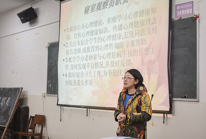学办主任晏莉强调大学生的心理健康一直是学校关注的重要问题。为了更好的让各个寝室联络员进行工作,院里拟定了“寝室联络员职责”,要求各位寝室观察员应该以身作则,保持自身心理健康,积极学习心理健康知识,宣传心理健康知识,传播心理健康理念;积极关注本宿舍学生的心理健康,发现问题及时报告老师,或推荐其寻求心理咨询师的帮助;配合学办老师参与心理危机干预的预警工作。