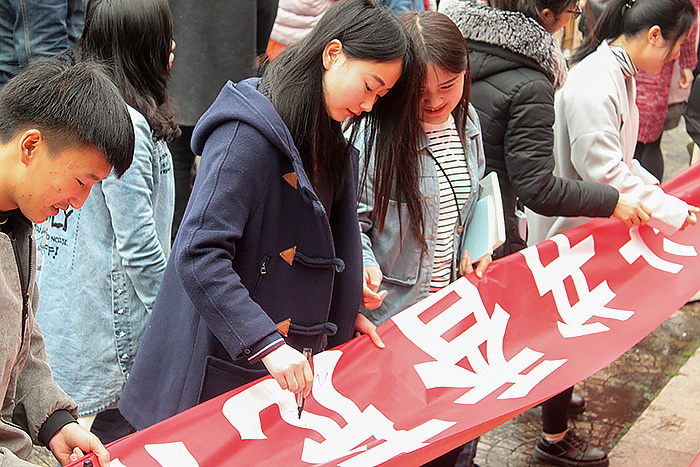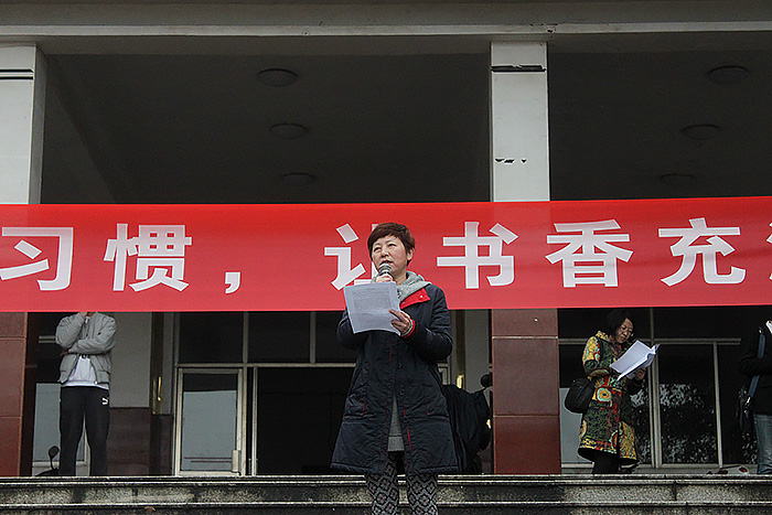 党总支副书记张曙为启动仪式致辞。她提到本次“读书月”系列活动目的在于营造良好的读书氛围,激发大家读书兴趣,让同学们在大量阅读实践中了解世界悠久的历史和灿烂的文化,感悟语言文字的博大精深。同时她还提到学院将围绕这一主题举行一系列活动,活动主要包括经典书籍推荐、经典影片欣赏、知识竞赛等。通过多种活动形式引导和鼓励大家养成多读书、读好书的良好习惯,以更加积极的姿态走入图书馆,以更加端正的态度投入学习,努力营造健康向上、清新高雅的校园学习氛围。最后,主持人发动横幅签字仪式,并宣布“读书月”活动正式启动。
