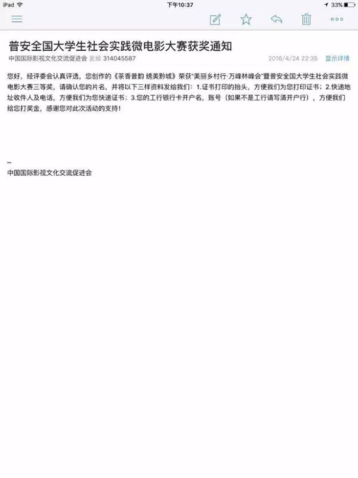 学子张春杰、江俊毅凭借《天下普安》《茶香普韵,锦美黔城》分别荣获普安大学生社会实践微电影二等奖和三等奖。