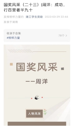 学院教学楼门口展示的胡冰晶和周洋两位国家奖学金获得者的优秀事迹海报,引得同学们驻足观看,纷纷表示会向优秀的学长学姐们看齐,以更加饱满地激情投入学习,争取将来在各自的领域发光发热。