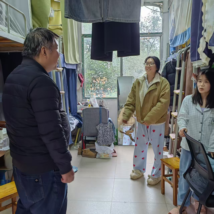 走访过程中,老师与同学们亲切交谈,详细询问大家的期末复习进度、备考状态及返乡时间,耐心倾听同学们心声,掌握学生思想动态。老师们叮嘱同学们要合理安排作息时间,劳逸结合提升复习效率,同时强化安全防范意识,严格遵守宿舍管理规定,养成“人走断电、人离关源”的良好习惯。针对部分备考压力较大的学生,老师们给予针对性的心理疏导与学习方法指导,鼓励大家坚定信心、沉着应考。