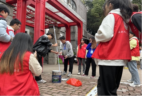 于五教前坪开展划停车线活动。学院党委书记施晓蓉、院长王兴业、党委副书记缪智文、副院长胡翔和艺馨社志愿者一起参加。