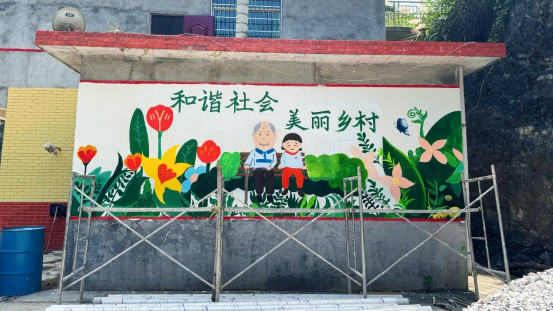 实践团队立马投身于墙绘创作中,成员们顶着烈日穿梭于乡间白墙旁,一笔一画,一描一绘,原本单调的墙面,在他们的巧手下焕发出新的生机与活力,不仅美化了乡村环境,更传递出积极向上的文化内涵。