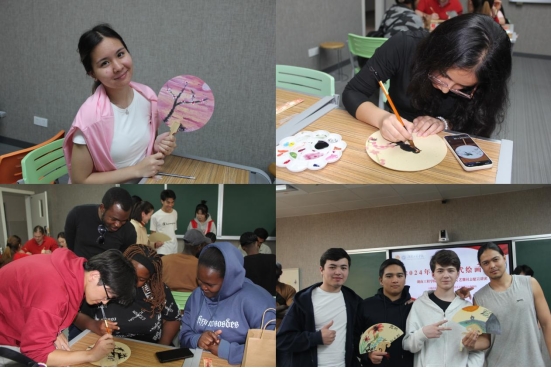 山水悠远,笔墨悠长。在手绘国风团扇的环节,同学们兴致勃勃地拿起画笔,在扇子上尽情释放自己的创意与灵感。留学生中有的认真临摹经典的国画作品,试图捕捉大师们的笔触与神韵;有的大胆发挥想象,创作出充满个性与现代感的图案。樱花动漫
