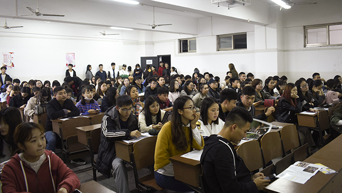 大四学生热情交流,同学们认真做记录,现场气氛活跃。