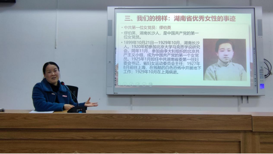 向前从“习近平总书记对妇女和妇女工作的重要论述”“贯彻男女平等基本国策”“榜样引领:湖南优秀女性的事迹”“学习践行,做“四自”女性”这四个方面进行讲述,深刻把握了“男女平等”是基本国策特指的范畴和目标指向,系统讲述了男女平等政策的地位、性质、功能与主要内涵,集中学习了向警予、胡筠、缪伯英、蔡畅、邵振维、吴仲廉、唐群英、秋瑾等湖南省优秀女性的感人事迹,进一步要求女同志们认真学习宣传贯彻党的二十大精神,贯彻并践行男女平等基本国策,做自尊、自信、自立、自强的“四自”女性。